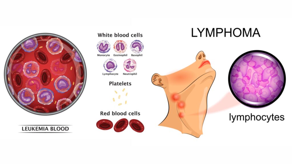Leukemia and lymphoma are types of cancers that originate in Lymphocytes. Leukemias refers to malignant cells circulating in the blood whereas in lymphomas, they are concentrated in lymph nodes.